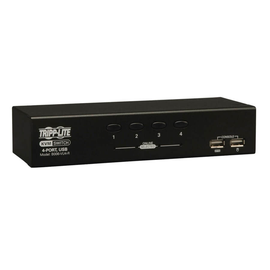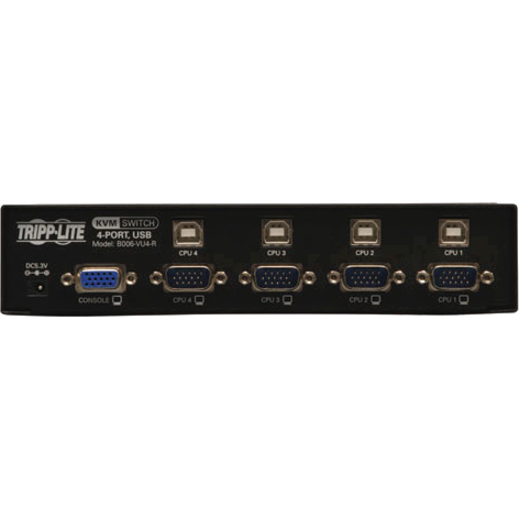 Tripp Lite's 4-port Desktop USB KVM Switch is the optimal solution for controlling up to 4 USB computers from one VGA monitor and USB keyboard/mouse. Manually switch between connected computers using pushbuttons or hotkey controls; or, monitor connected computers automatically via Auto Scan Mode. The B006-VU4-R is operating system independent, and works with all computers that have an available VGA and USB port. It supports video resolutions up to 2048 x 1536, and features a compact design that does not require software or complicated set-up procedures. Constructed of heavy-duty steel housing. 3 year limited warranty.