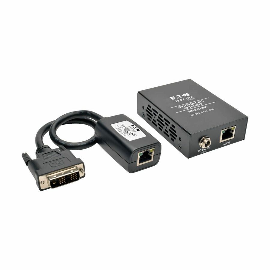 The B140-101X is a DVI Over Cat5 Active Extender Kit that comes with both transmitter and receiver units. It transmits a DVI-D Single-Link signal up to 200 ft. away using a single Cat5e/6 patch cable. To achieve maximum distance and resolution, use 24AWG Solid Wire Cat5e/6 cable (Tripp Lite's N202-Series). The B140-101X is compatible with all operating systems, and is plug and play, with no software or drivers required. It features a built-in Equalization control for adjustment of the video image. Compliant with the Federal Trade Agreements Act (TAA) for GSA Schedule purchases. Installation is simple. Connect a the built-in DVI connector on the transmitter unit to a DVI source. Connect the receiver unit to a display using a Tripp Lite P561-Series DVI cable (not included). Finally, the RJ45 ports on the transmitter and receiver units are connected using a single Cat5e/6 cable. A 1920 x 1080 @ 60Hz signal can be extended up to 150 ft. from the source,, or a 1024 x 768 @ 60Hz signal up to 200 ft.. Further expand the range and number of monitors by using a B140-110 repeater unit. Add up to four remote units (three repeaters and one active receiver) in a single chain, for a total of 4 displays. (An active receiver should be the last unit in a chain) A 1920 x 1080 @ 60Hz signal can be extended up to 125 ft. from each repeater to the next unit in the chain, or a 1024 x 768 @ 60Hz signal can be extended up to 175 ft..