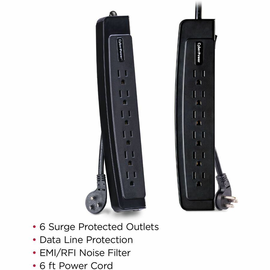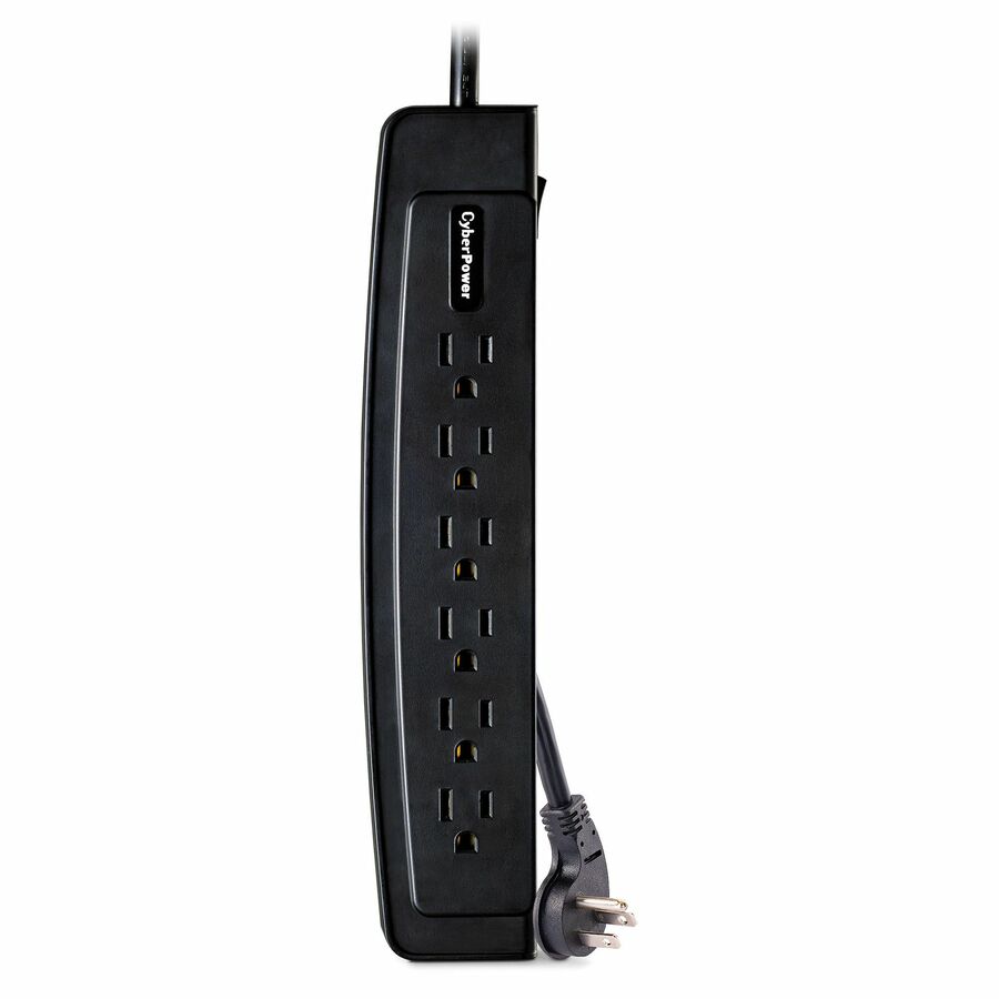 The CyberPower Professional Series CSP606T Surge Suppressor is ideal for Home/Office protection with 1350 joules, 6 outlets, RJ-11 phone line protection, and a 6 FT cord. The surge suppressor is ideal for protecting personal computers, phones/fax/modems, printers, stereos, and consumer electronics. The CSP606T features (6) outlets including (1) widely spaced outlet, MOV technology to guard the surge suppressor and connected electronics against line abnormalities and lightning surges, while EMI/RFI filters block unwanted line noise. Data line protection is provided via RJ-11 ports for telecommunication devices such as phones, faxes, modems, and DSL lines. The 6 Ft. power cord includes a right angle plug with a 45° off-set for installation in the tightest of environments. A Limited-Lifetime Warranty ensures the highest quality standards in design, assembly, material or workmanship and further protection is offered by a 75,000 Connected Equipment Guarantee.
