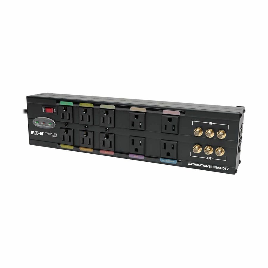 Tripp Lite's HT10DBS Isobar Home/Business Theater Surge Suppressor provides premium protection--3840 joules--stopping damaging surges and filtering disruptive line noise so components perform at their peak! You can see and hear the difference: sharper, crisper video; deeper, fuller audio and longer component life spans. Perfect for medium-to-large home/business theater installations: high-definition TVs, PVRs, satellite and A/V receivers, subwoofers, DVD/CD players and more. Exclusive Isolated Filter Banks eliminate noise interference between components. 10 outlets (with transformer spacing and plug-in safety covers), 3-line coaxial protection, 1-line tel/modem protection and 1-line network (100BaseT, high-speed) protection safeguard an entire home/business theater system. 500,000 Ultimate Lifetime Insurance coverage (USA and Canada only). Includes all-metal housing, color-coordinated outlet/plug labels, three diagnostic LEDs, 8-ft. cord with a right-angle plug, 6-ft. gold coax cable, 6-ft. phone cord and 6-ft. network cable.