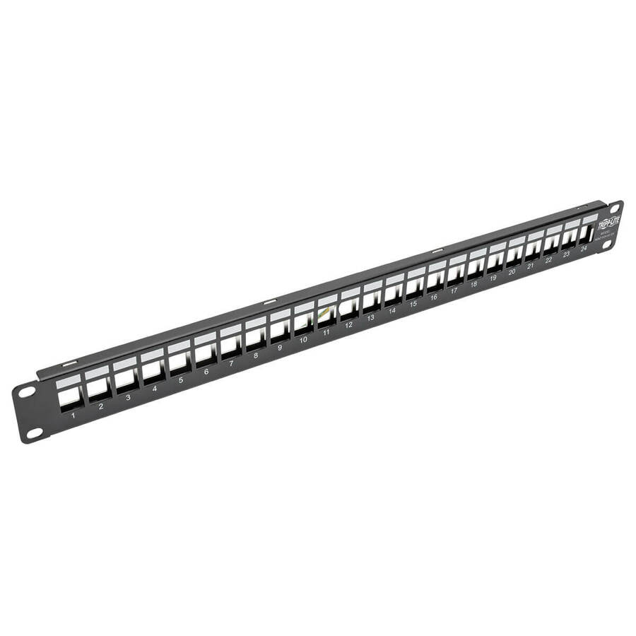 The N062-024-KJ-SH 24-Port 1U Rack-Mount Shielded Blank Keystone/Multimedia Patch Panel manages and organizes the cabling in your network. The 24 blank cutouts accommodate all Tripp Lite keystone jacks, and some other keystone jacks in the market, including RJ45 Ethernet, HDMI audio/video, voice and USB applications. The rear cable manager keeps cables neat, tidy and efficiently organized on the back of the panel. Ports are clearly numbered to help you identify connections. Mounts easily into 1U of an EIA-standard 19-inch two-post rack or wall-mount rack enclosure. Made from fully shielded, heavy-duty steel. Grounding wire included.