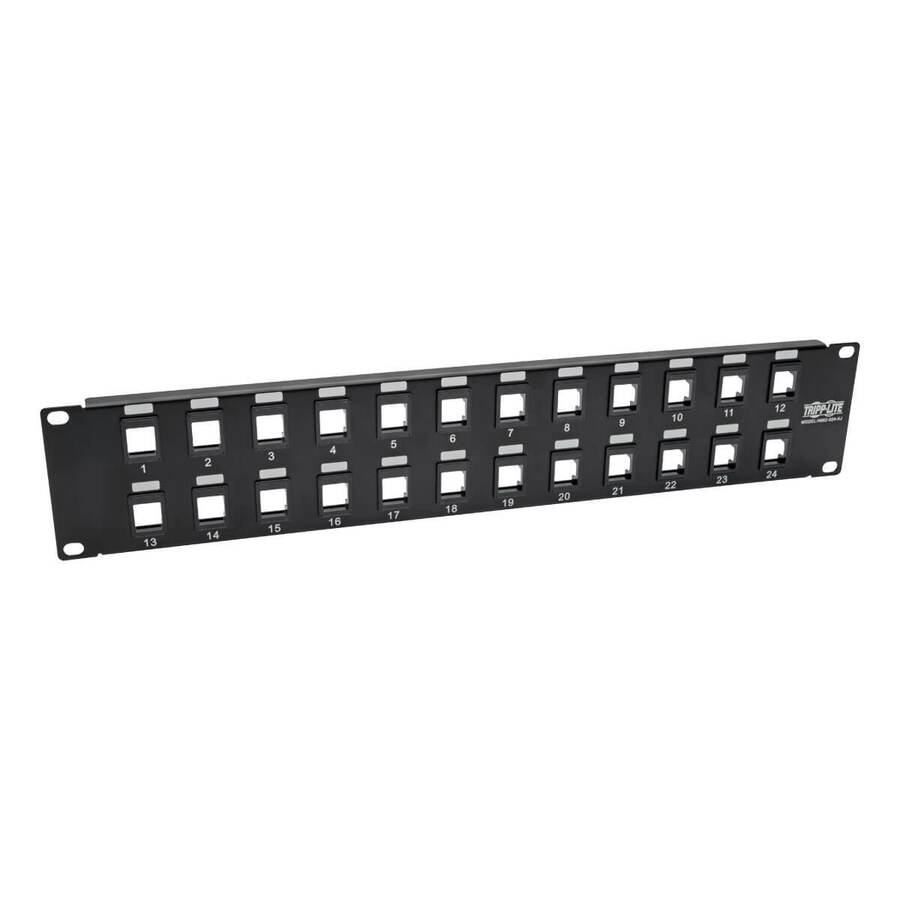 The N062-024-KJ 24-Port 2U Rack-Mount Unshielded Blank Keystone/Multimedia Patch Panel manages and organizes the cabling in your network. The 24 blank cutouts accommodate all Tripp Lite keystone jacks, and some other keytstone jacks in the market, including RJ45 Ethernet, HDMI audio/video, voice and USB applications. Ports are clearly numbered to help you identify connections. Mounts easily into 2U of an EIA-standard 19-inch two-post rack or wall-mount rack enclosure. Made from heavy-duty cold-rolled steel. Grounding wire included.