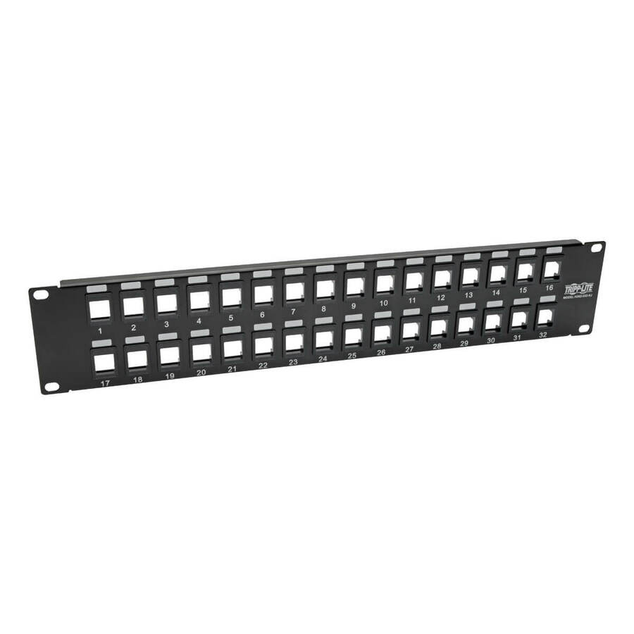 The N062-032-KJ 32-Port 2U Rack-Mount Unshielded Blank Keystone/Multimedia Patch Panel manages and organizes the cabling in your network. The 32 blank cutouts accommodate all Tripp Lite keystone jacks, and most other keystone jacks in the market, including RJ45 Ethernet, HDMI audio/video, voice and USB applications. Ports are clearly numbered to help you identify connections. Mounts easily into 2U of an EIA-standard 19-inch two-post rack or wall-mount rack enclosure. Made from heavy-duty cold-rolled steel. Grounding wire included.