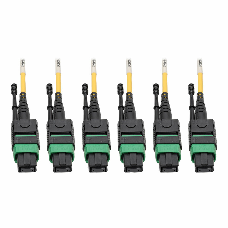 The N392-15M-3X8-AP MTP/MPO (APC) Singlemode Slim Trunk Cable (3xF/3xF) supports 40/100 Gb Ethernet speeds and is designed for high-density connections between network equipment in telecommunication rooms and data centers. With three female MTP/MPO connectors on each end, this singlemode fiber optic cable is recommended for high-density fiber patching between data center MDFs (main distribution frames) and IDFs (intermediate distribution frames). The factory-terminated 8-fiber MTP/MPO connectors are about the same size as SC connectors, but are 12 times denser, freeing up rack space for other cables. The APC connectors are angled to prevent infrared light entering the fiber from bouncing back into the laser. Optimized for QSFP+ 40GBASE-PLR4 and QSFP28 100GBASE-PSM4 networks, this cable is tested for low insertion loss and back reflection on every connector and attenuation loss that meets or exceeds current standards.The N392-15M-3X8-AP is colored yellow for instant identification in a crowded switch or patch panel as a singlemode cable. Push/pull tab connectors are easily accessible in high-density data center applications and make the plug-and-play cable easy to install and remove with one hand. The 6-millimeter dual plenum-rated jacket and bend-insensitive fiber are perfect for connecting high-speed network components in ceilings, walls and ducts.