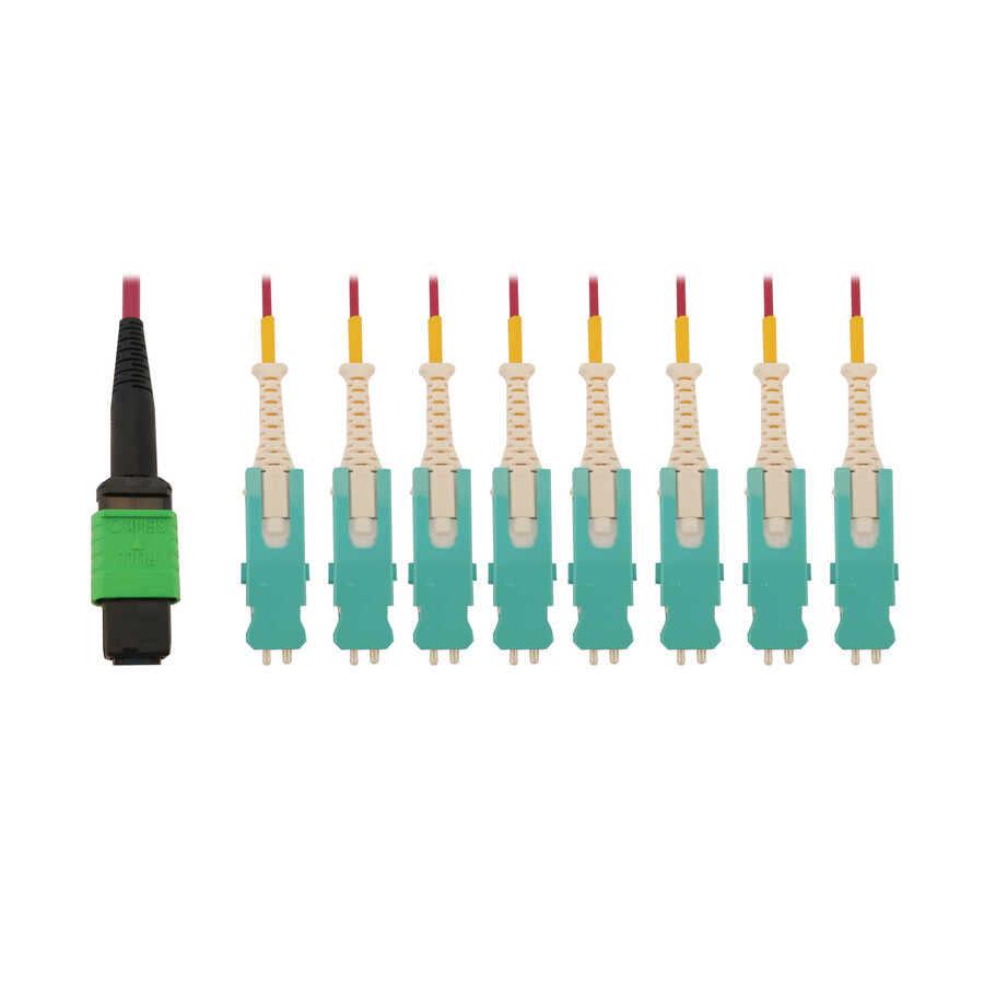 40/100/400 GbE Cable Supports High Bandwidths for High-Density Data NetworkingThe N845-03M-8S-MG is a premium multimode fiber optic cable that supports 400 Gb Ethernet speeds for transmitting data and voice signals over short distances. As the amount of traffic in data networks grows, so does the need for next-generation devices and fiber cables to support much higher bandwidths in cloud services, hyperscale data centers, telecom applications and equipment OEM companies. This OM4 breakout cable is an ideal choice for 400 Gb Ethernet applications. It is also backward compatible with 40 Gb and 100 Gb networks, so you can future-proof your current application for an eventual upgrade to 400 Gb.
