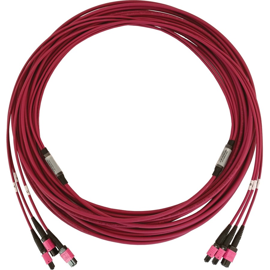 40/100/400 GbE Cable Supports Higher Bandwidths Needed for High-Density DataNetworkingThe N858B-15M-3X8MG is a premium multimode fiber optic cable that supports 400 Gb Ethernet speeds for transmitting data and voice signals over short distances. It is designed to support higher bandwidths in cloud services, hyperscale data centers, telecom applications and equipment OEM companies. This multimode 50/125 OM4 cable is an ideal choice for 100 Gb Ethernet applications up to 100 meters (328 feet) at 850 nm. It is also backward compatible with 10 Gb and 25 Gb networks, so you can future-proof your current application for an eventual upgrade to 100 Gb or 400 Gb.Magenta-Colored Jacket Helps Avoid Misidentification That Can Cause Costly DowntimeThe OM4-rated cable has a magenta jacket to identify it as multimode in a crowded patch panel or switch and prevent it from becoming accidentally disconnected. The round low-smoke zero-halogen (LSZH) jacket limits the amount of toxic smoke emitted in case of combustion, making it suitable for poorly ventilated areas. The connectors' slim boots and magenta housings allow easy one-handed installation and removal of the cable.