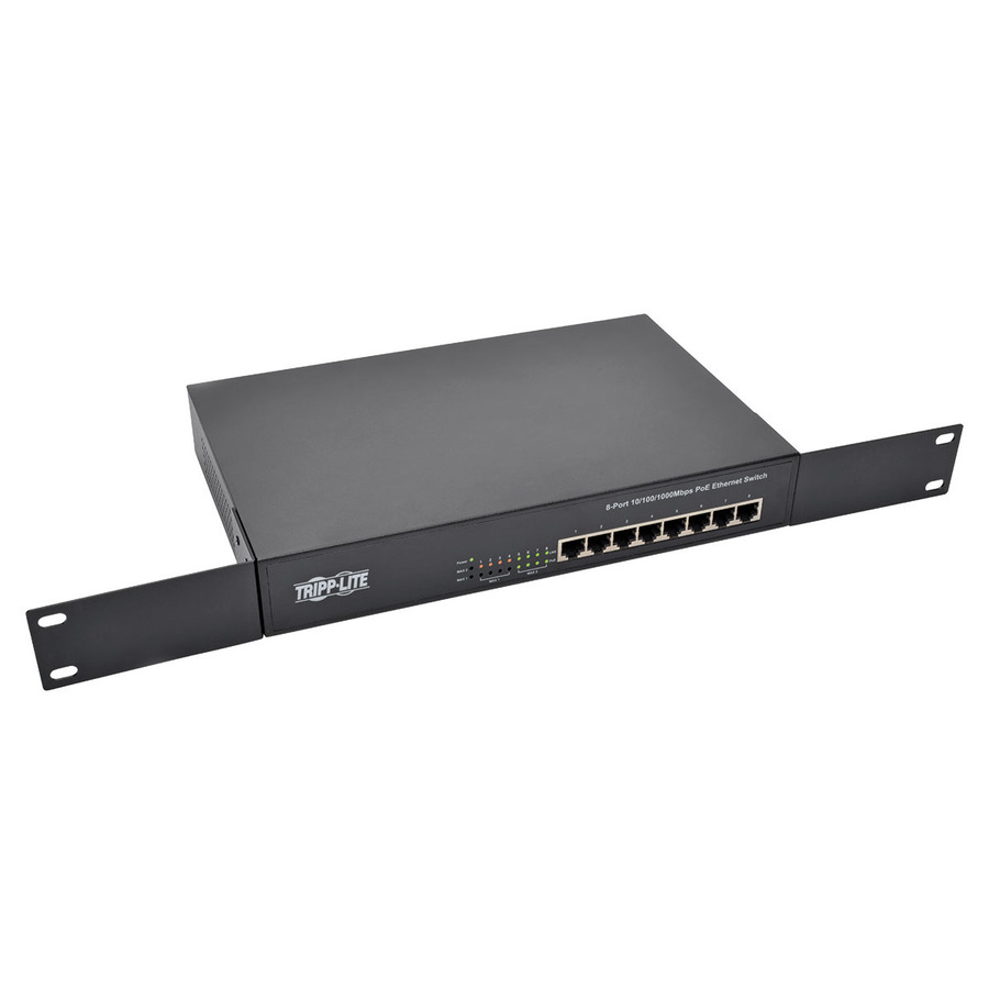 The NG8POE 8-Port 10/100/1000 Mbps 1U Rack-Mount/Desktop Gigabit Ethernet Unmanaged Switch adds a Gigabit Ethernet connection with PoE+ capacity to your small office, workgroup or creative workspace. Especially recommended for security applications to power IP cameras, VoIP phones and other PoE-compatible devices, this energy-efficient switch provides PoE+ compatibility with wireless access points and other devices with up to 30W per port and a PoE budget of 140W (up to 70W per port bank). Sharing large bandwidth-intensive files, such as CAD drawings and high-definition videos, at Gigabit speeds improves efficiency and cuts costly downtime. IEEE 802.3x flow control allows smooth transmission.This unmanaged switch features eight twisted-pair RJ45 Gigabit Ethernet ports that support auto-negotiable 10/100/1000 Mbps and auto MDI/MDIX cross-over detection. It's plug-and-play with no configuration required and can be up and running immediately. Easy-to-read LEDs indicate power, connection, activity and PoE status for each port. The NG8POE supports IEEE 802.3az Energy Efficient Ethernet standards by putting unused ports into a low-power state without interrupting network connections. The detachable five-foot power cord with NEMA 5-15P plug connects to any compatible AC source. The heavy-duty metal housing is designed for desktop installation or mounting into 1U of an EIA-standard 19-inch rack with the included brackets.