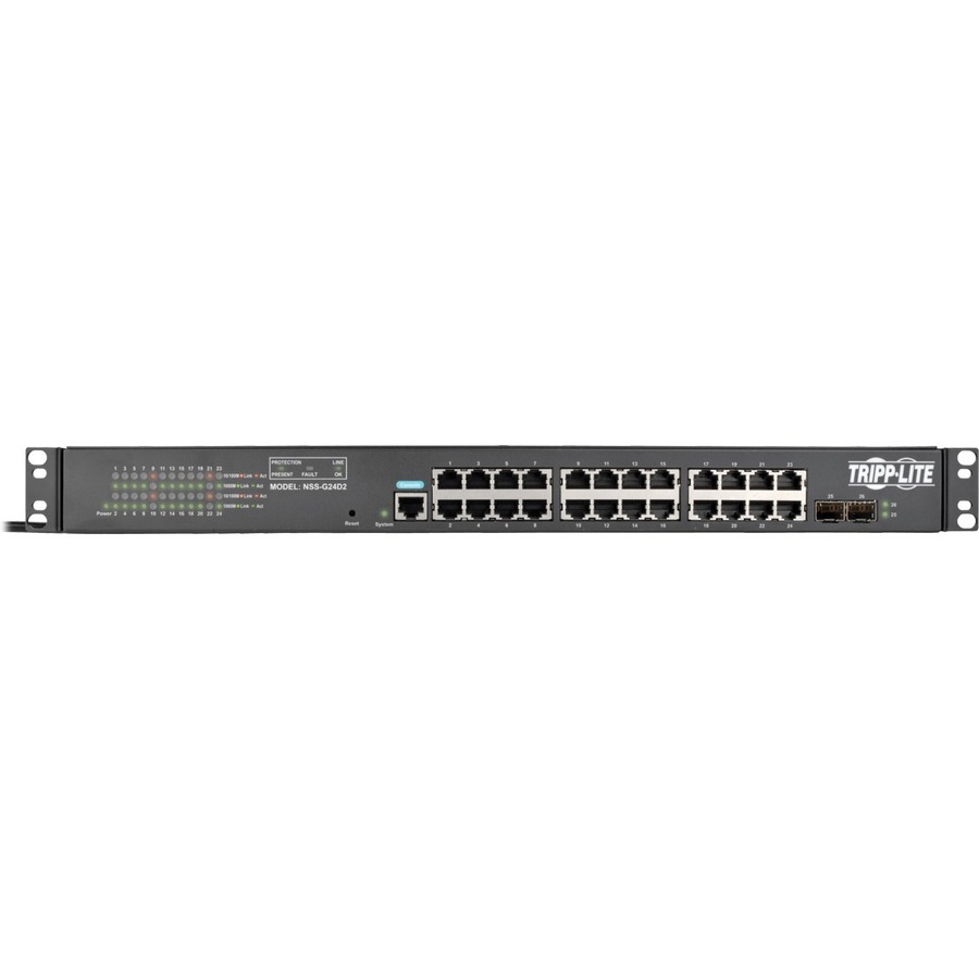 The energy-efficient NSS-G24D2 24-Port Gigabit L2 Web-Smart Managed Network Switch does more than complete your home or office LAN. It also features a basic 120V 15A PDU to distribute reliable AC power to critical IT equipment in your wiring closet, server room or equipment rack. Two dedicated SFP ports are also included for uplinking data to other switches via optical fiber or copper.This switch features 24 twisted-pair RJ45 Gigabit Ethernet ports that support auto-negotiable 10/100/1000 Mbps and auto MDI/MDIX cross-over detection functions for convenient plug-and-play capability. Easy-to-read LEDs indicate connection and activity status for each port. Built-in management software lets you monitor and control each connected device via secure web-based interface. Each port supports up to 2 Gbps with full duplex.The rear panel contains 12 NEMA 5-15R outlets that supply continuous power to connected devices. Your equipment is protected by 3860 joules of Isobar surge suppression, as well as front-panel LEDs that let you monitor line status at a glance. A 12A circuit breaker trips if the current drawn by connected equipment exceeds the PDU's maximum load rating.The NSS-G24D2 supports IEEE802.3az Energy Efficient Ethernet standards. The heavy-duty metal housing mounts into 1U of an EIA-standard 19-inch rack using the included hardware. The six-foot input cord with NEMA 5-15P plug connects to a protected UPS, generator or mains input AC source.