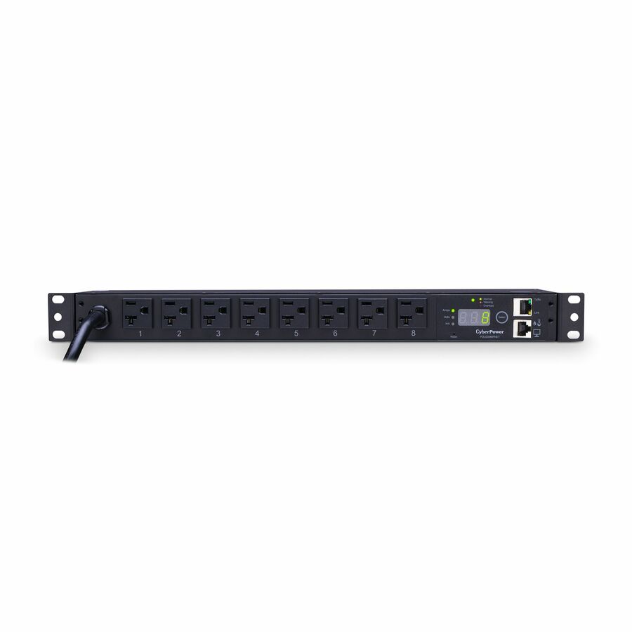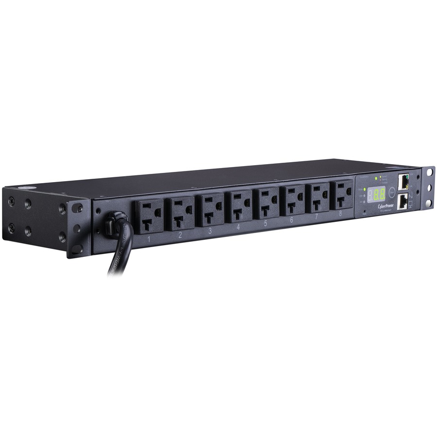 The CyberPower (PDU20M8FNET) 8-outlet 1U rack mount monitored power distribution unit (PDU) provides 120V 20A output. It distributes power to 8 NEMA 5-20R receptacles from a single NEMA 5-20P plug, with unfiltered electrical pass-through. Power status can be monitored over the network, using CyberPower Management Console and the RJ45 Ethernet port for local network connection, or locally using the LCD. The front LCD displays the electrical current used by connected equipment in amps and can be toggled to display input voltage, power being consumed in watts, and the IP address of the network interface.
