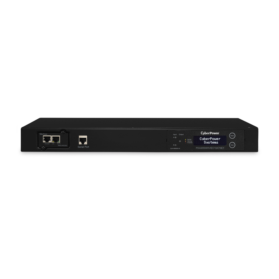 Product Features:Manufacturer:CyberPower Systems, IncManufacturer Part Number:PDU20SWHVIEC10ATNETManufacturer Website Address:http://www.cyberpowersystems.comBrand Name:CyberPowerProduct Series:Switched ATS PDUProduct Model:PDU20SWHVIEC10ATNETProduct Name:PDU20SWHVIEC10ATNET Switched ATS PDU 200-240V 20A 1U 10-Outlets (2) IEC C20