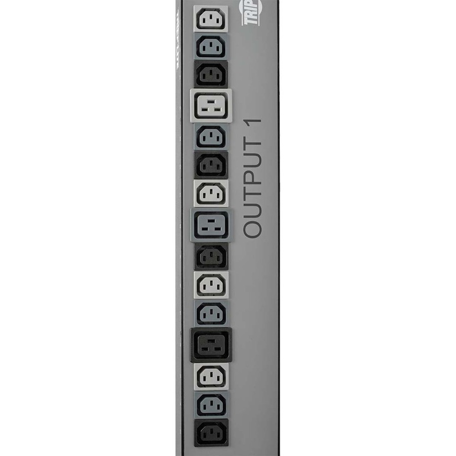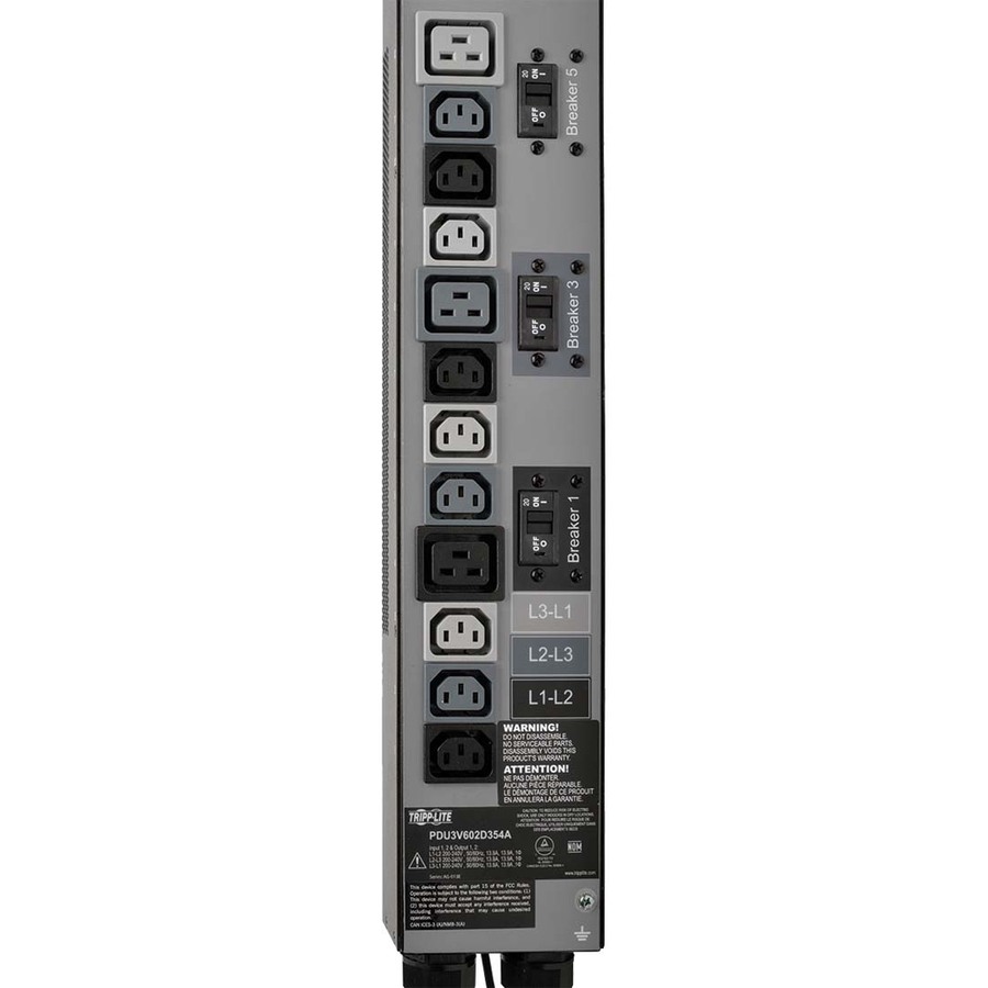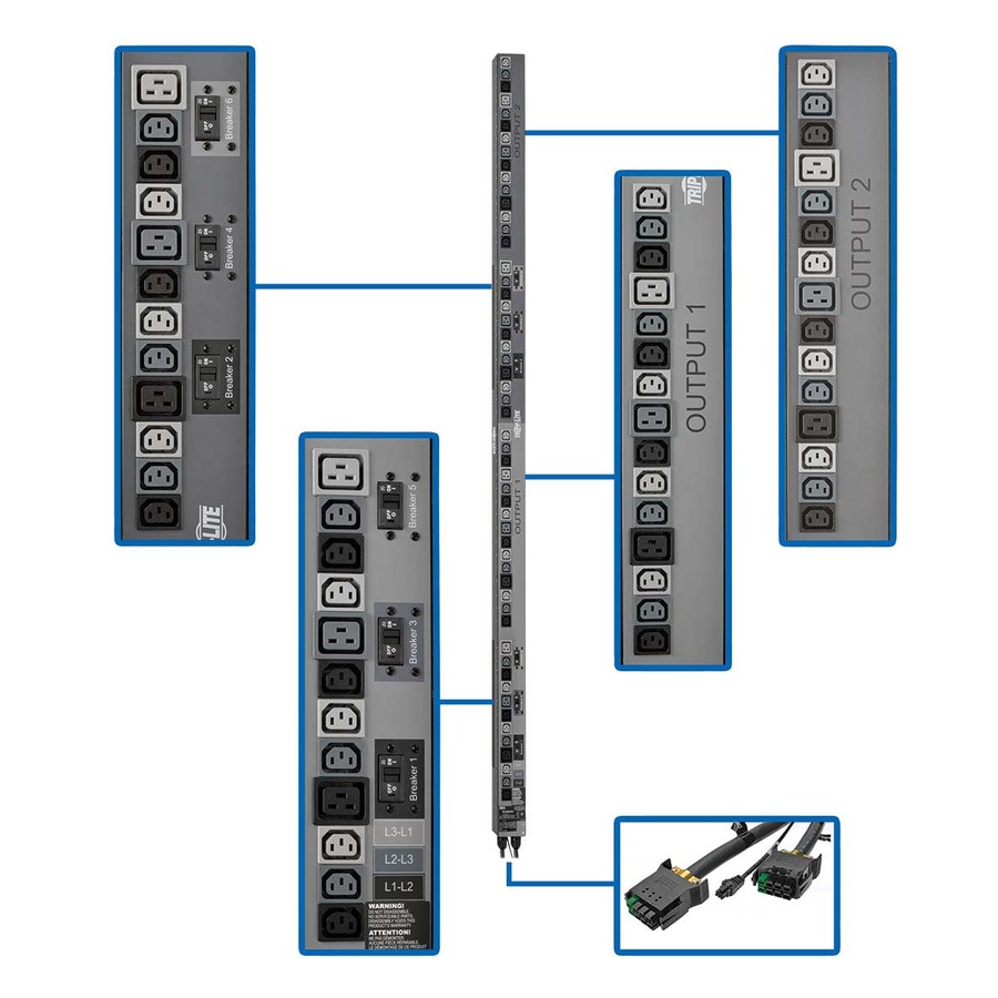 The PDU3V602D354A 17.3kW 3-Phase Vertical PDU Outlet Strip is a required accessory option for Tripp Lite's PDU360AT6G60 and other 3-phase ATS PDUs that specify compatibility with this model. It's recommended for high-density equipment racks in data centers, server rooms and heavily configured equipment racks.When used with the PDU360AT6G60, the PDU3V602D354A supports up to 17.3kW total output with 27.8A balanced maximum full load per output phase combination (L1-L2, L2-L3, L3-L1) and 13.9A balanced maximum per breakered output load bank (C1-C6).The 42 C13 and 12 C19 single-phase 208V outlets receive power from the connected ATS PDU. The outlets are interlaced to help you balance loads by spreading connections across the phase combinations throughout the rack. Each outlet is numbered and color-coded to help you keep track of connected devices and which phase combination powers each. Dual 2.5-foot power cords, each with a special eight-position plug, connect directly to the PDU's rear receptacles. The PDU3V602D354A's rugged all-metal housing mounts in compatible racks with no tools needed. Vertical 0U installation reduces cord clutter and improves airflow through the rack.