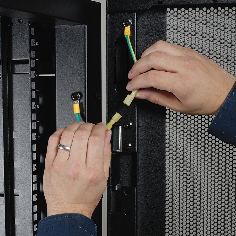 45U SmartRack Enclosure ships mounted on a special pallet that features additional reinforcement and shock-absorbing material. The pallet's protective cushion safeguards the enclosure and the precision components it contains during re-shipping. Reinforced pallets and reusable packaging provide the flexibility to fully configure rack enclosures in a centralized location and safely re-ship them to remote sites, saving significant service costs. They also allow the freedom to custom-configure enclosures with network and server hardware along with UPS systems, PDUs, KVM switches and a variety of other devices prior to final installation. At the desired location the SR45UBSP1 can be easily maneuvered with its preinstalled casters and can be secured by adjusting the preinstalled levelers.