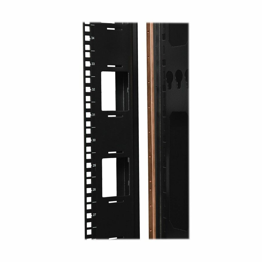 The SRGROUND is a full length (42U) bus grounding bar made from heavy-gauge solid copper that attaches to Rack Enclosure Cabinets or Open Frame Racks to provide convenient ground contact for standard rackmount equipment. Every U space has a drilled and tapped hole to allow a ground wire "jumper" to be installed. The jumper then bridges to the individual pieces of equipment, allowing a direct path to ground rather than going through surrounding equipment. The SRGROUND can mount in a Tripp Lite enclosure in two ways, it can be screwed into the Rack Enclosures (hardware included) or it can be installed using the tool less mounting buttons in the Open Frame Racks.