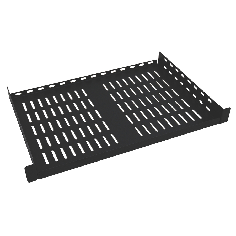 Fixed Shelf, 1U Cantilever mount, Cold rolled steel with black finish. Required mounting hardware included. Supports up to 30 lbs. Uses two shelves back to back to create a deep, fixed shelf in 2POST racks.