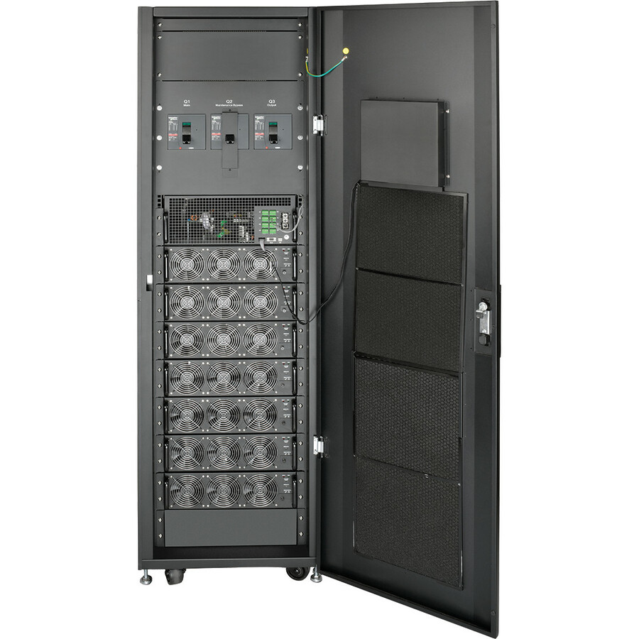Tripp Lite's SVX210KL7P 210kVA / 210kW SmartOnline large-chassis UPS includes installed Input, Bypass and Output breakers, a Static Transfer Switch (STS) and 7 included 30kVA SVX30PM power modules. The system includes space for 1 additional user installable SVX30PM power module for N+1 fault-tolerance.Featuring modular, scalable design with high efficiency voltage and frequency independent / VFI operation, Tripp Lite's SVX Series SmartOnline UPS systems are ideal for the protection of a wide variety of critical IT systems. Scalable, modular configuration enables UPS capacity upgrades and hot-swap power supply maintenance without costly downtime. Over 95% efficient in standard online-mode and over 99% efficient in optional economy-mode enables reduced operating and cooling costs. Unity power factor configuration provides equal kVA and kW output ratings for up to 25% more wattage capacity than common 0.8 - 0.9 power factor competing designs. Network-grade sine-wave AC output with 1% output voltage regulation and less than 1.5% output total harmonic distortion. Advanced IGBT inverter with Digital Signal Processor (DSP) technology provides for less than 3% input total harmonic distortion (THDi) to support 1:1 generator sizing. Dual input hardwire design enables operation from one or two input power sources for enhanced system availability. N+1 fault-tolerance is supported anytime there is an "extra" SVX30PM 30kW power module installed beyond the minimum required quantity. Automatic and manual bypass options keep connected equipment operational during routine maintenance or critical power module failure. UPS batteries are not included, External ±240VDC battery cabinets sold separate.