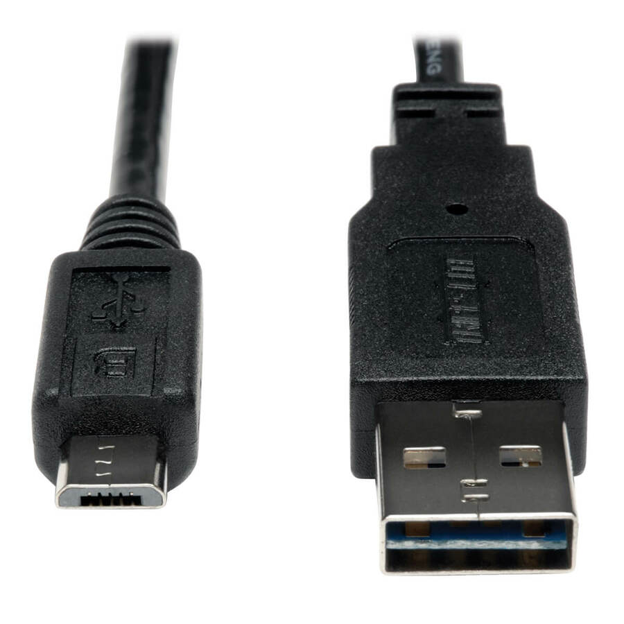 Tripp Lite's UR050-006-24G 6-ft. USB 2.0 A to Micro-B cable features a Universal / Reversible "A" connector, which takes the guesswork out of which way to position the "A" connector for plugging. Micro-USB is the latest generation of USB connector, and is found on Cell Phones, PDA's, USB On-the-Go ( OTG ) devices, Digital Cameras, Tablets and more. Constructed of premium double-shielded cable with tinned copper braid and aluminum mylar foil featuring twisted 28AWG data lines and 24AWG power lines. 24AWG power lines allow for charging of higher powered devices such as tablets, which standard 28AWG Micro USB cables can't sufficiently charge. USB 2.0 rated cable handles 480Mbps data transfer rates.